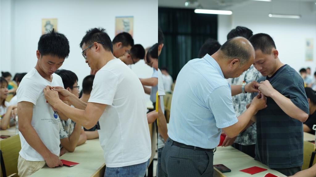 宣誓仪式在庄严的《国际歌》中拉开帷幕。张涛宣布本次新发展的预备党员名单,在员工党员代表李昕淼的领誓下,新发展的党员面向鲜艳的党旗,举起右手,庄严宣誓,表达对党的忠诚、为共产主义事业奋斗终生的决心。与会老党员与新党员一同宣誓,重温入党誓词。随后,郭宏、张涛以及各支部书记一一为新党员佩戴党员徽章。