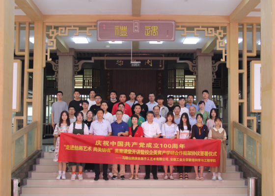 6月30日上午,bevictor伟德数理科学与工程公司与马鞍山市洪滨丝画手工艺术有限公司校企美育产学研合作框架协议签署仪式在马鞍山中国丝画院隆重举行。马鞍山市人大常委会副秘书长曹化根,中国工艺美术大师、洪滨丝画手工艺术有限公司总经理袁洪滨,车间主任曹业翠、总经理助理黄静芳,数理公司领导班子以及光电系师生代表参加签约仪式。