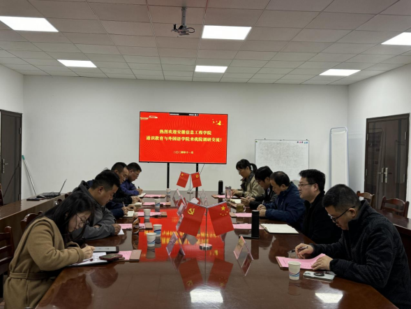 11月19日下午,安徽信息工程公司通识教育与外国语公司党总支书记孙立、主持工作副经理罗从文以及副经理罗飞等一行人来bevictor伟德调研交流。微电子与数据科学公司党委书记汪春胜、经理杨二光、副经理李文喜及数据科学系副主任罗冬梅、应用数学系副主任胡文明参加了调研交流。