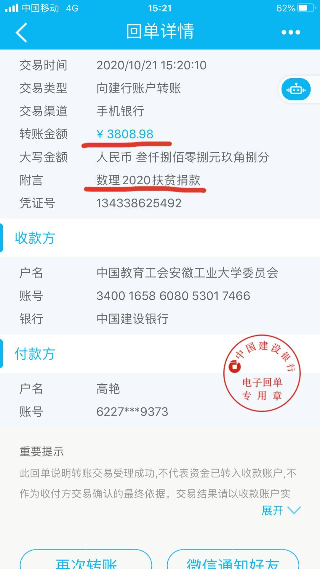 为响应校工会组织的2020年定向扶贫捐款活动,数理公司老师们积极参与为贫困乡镇捐款,全院110人,其中97人参与捐款,共计捐款3808.98元,此次捐款将用于六安市裕安区西河口乡红石岩村和独山镇沙岗店村扶贫项目。现将捐款明细及上交款项公示。