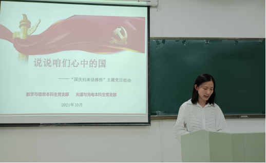 计梦圆同学则介绍家乡在脱贫攻坚、美丽乡村建设、群众文化方面发生的巨大变化。梅庆染同学将目光放在了国庆期间仍在默默守护岗位的环卫工人、医护工作者、警察的伟岸身影上,他感慨到;岁月静好、生活幸福,是总有人在背后辛勤付出。党员王克珩说到:今年喜迎国庆,那一抹“中国红”尤其显得靓丽,让我激动不已,如果信念有颜色,那一定是中国红。”同学们纷纷结合自己国庆期间的所见、所闻分享了自己的心得与感悟。