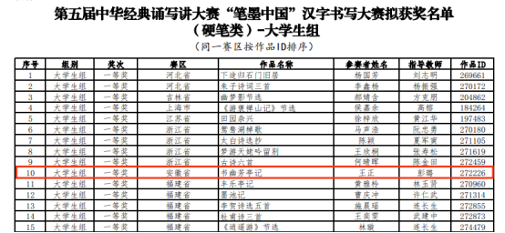 中华经典诵写讲大赛由教育部、国家语委主办,大赛以“书香新时代,‘典’亮新征程”为主题,通过诵读、书写、篆刻等语言文字表现形式,诠释中华优秀文化内涵、彰显中华语言文化魅力、弘扬中国精神。第五届中华经典诵写讲大赛“笔墨中国”汉字书写大赛已完成全部赛程,共评选出老员工组硬笔书法一等奖作品32幅,其中安徽赛区仅有王正同学获一等奖。下一步,公司将进一步学习贯彻习近平文化思想,引导师生继承和弘扬中华优秀传统文化,厚植爱国主义精神,坚定文化自信自强。(撰稿:张佳良 审核:陈恳 张敏)