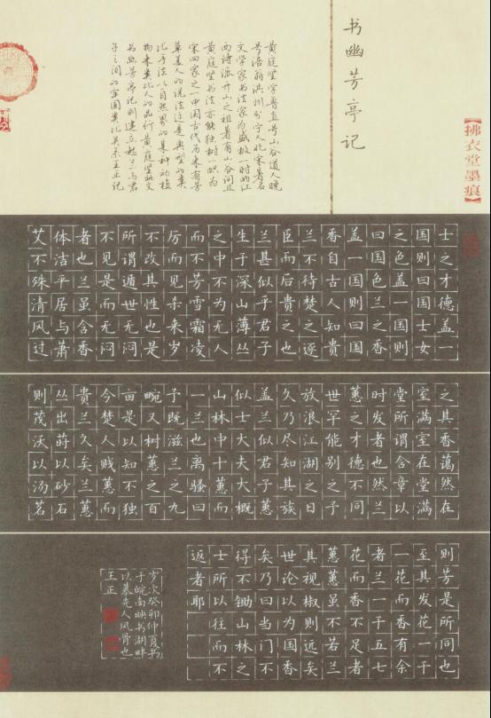 《书幽芳亭记》以君子精神为主旨,表达君子“穷”“达”的立身处世,“穷”时应当低调谦逊,不刻意追求,如兰花香气并不明显,隐没在其他花草中;“达”时应把握时机,施展自己的才华,尽心尽力地报效国家民族,鞠躬尽瘁。整幅书法作品具有块面感,正文采用规范楷书,虚线的界格让作品更加工稳而有气势,并在上方配以小字行书题跋,右上方题签标题,落款部分简短而精炼。楮墨无言,而落笔有声;方寸有界,而点画无穷。