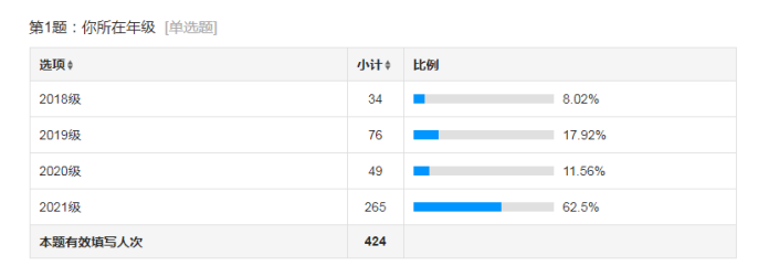 3月11-13日,公司利用问卷星平台,组织了员工在线上填答了《数理科学与工程公司2022年春季开学老员工思想动态调查问卷》,共有424名员工填写问卷,此次问卷调查的对象为公司大一到大四的在校员工,整个过程共持续了3天,保证了样本的代表性和广泛性。