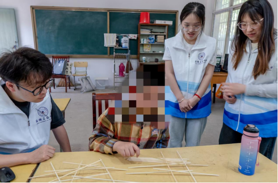 5月29日上午,科普团队来到雨山中心小学中超分校,为残疾儿童林同学送去一对一科普课程。活动开始前,志愿者们向林同学赠送了学习生活用品和科普实验套装,并亲切询问了他的学习生活情况。针对该生身体状况,团队创新采用“沉浸式”教学模式,精心设计“倍力桥的力学奥秘”主题课程。通过纪录片、三维动画、触觉教具等多种教学手段,将抽象的力学原理转化为可感知的实践操作。在志愿者耐心引导下,林同学用木条成功搭建倍力桥,亲身感受了科学的神奇魅力。